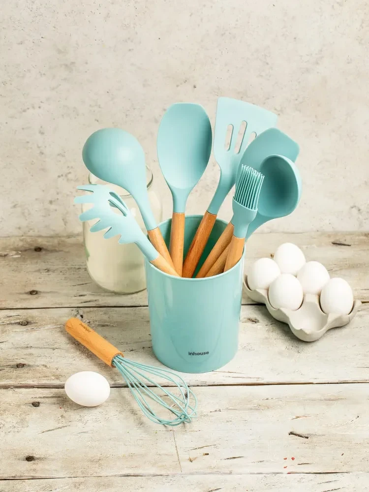 Комплектация - лопатка кулинарная с прорезями, ложка кулинарная, плоская кулинарная ложка, ложка для спагетти, половник, шпатель кулинарный, кисть кулинарная, венчик для взбивания, подставка.