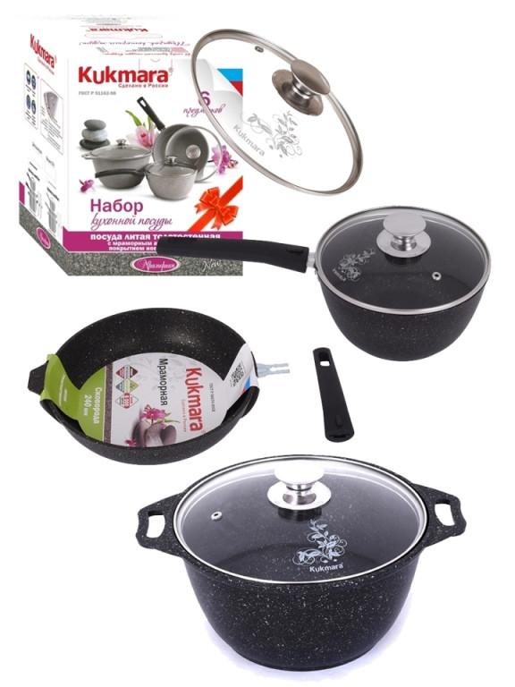Набор посуды Kukmara станет прекрасным подарком на любое торжество и оставит приятные воспоминания на долгие годы. В состав набора посуды линии Мраморная входят кастрюля 4 л. со стеклянной крышкой и сковорода 24 см. со съемной ручкой - идеальный тандем для успеха на кулинарном поприще! Стеклянная крышка подходит и для кастрюли, и для сковороды. Посуда имеет отличные теплораспределительные и теплоаккумулирующие свойства, и блюда в ней получаются сочными и ароматными.