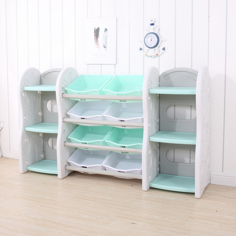 Стеллаж для игрушек с ящиками и полками выполнен из качественного пластика. Данный материал экологичен и прост в чистке. Небольшой вес стеллажа и его устойчивая конструкция обеспечивают ребёнку безопасность от ушибов.