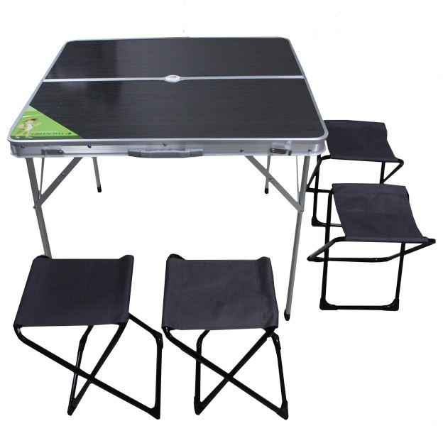 Складной стол и 4 табурета немаркого темного цвета, компактные и легкие, будут незаменимы на пикнике, пляже, даче, в походе. Углы закруглены и не травмоопасны. Столешница изготовлена из древоволокна в центре имеется отверстие для зонта. Устойчивые стальные стойки. Табуреты в собранном виде помещаются внутрь стола. В сложенном виде набор имеет форму компактного чемодана с ручками.